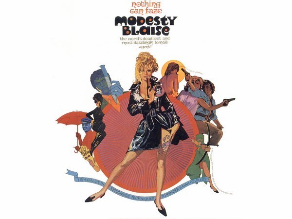 Modesty no responde al modelo cultural de la mujer objeto y sumisa aún vigente por aquellos años, sino que llama la atención por su independencia y ambición de poder, calculada inteligencia, férrea voluntad y capacidad de lucha, cualidades todas ellas exclusivas hasta entonces de personajes masculinos. En este sentido, Modesty Blaise introduce en el cómic de los sesenta el arquetipo de la sensual pero a la vez liberada heroína, que también encontramos en la voluptuosa Valentina de Guido Crepax o en la futurista Barbarella de Jean-Claude Forest. Esta última tuvo una lograda adaptación cinematográfica dirigida por Roger Vadim y protagonizada por Jane Fonda en 1968, profundamente impregnada de la estética pop de la época, asimismo presente en la adaptación que, dos años antes, se había hecho de la propia Modesty Blaise. Dirigida por Joseph Losey, esta spy-fi se aleja del guión escrito por O’Donnell para introducir, en su lugar, una delirante y paródica visión camp de las películas de agentes secretos protagonizada por Monica Vitti, acompañada en el reparto por Terence Stamp, quien interpreta a Willie Garvin, el fiel compañero de aventuras, y por Dirk Bogarde, como el villano Gabriel.