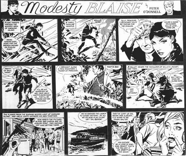 Si el más famoso de los agentes secretos había iniciado sus intrépidas aventuras en las novelas de Ian Fleming y de ellas había pasado al cine y a las tiras de prensa –las populares daily strips-, Modesty Blaise nació directamente como tira de prensa en las páginas del periódico londinense Evening Standard en 1963, si bien su conversión en icono popular pronto le llevó a protagonizar su propia adaptación cinematográfica así como varias novelas. El creador de la serie fue el guionista inglés Peter O´Donnell, que la escribió en su totalidad hasta que, ya octogenario, decidió concluirla en 2001, mientras que sus principales dibujantes fueron Jim Holdaway y el español Enric Badía Romero.